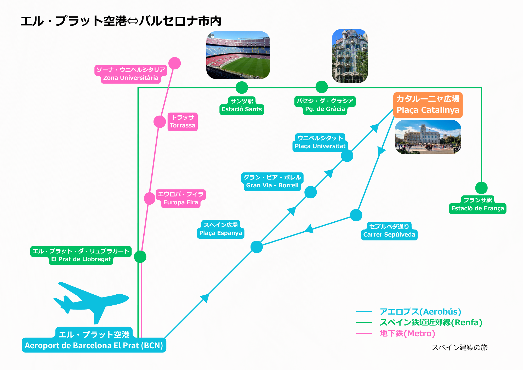 バルセロナ=エル・プラット空港 Aeroport de Barcelona El Prat (BCN)からの移動手段はいくつかありますが、