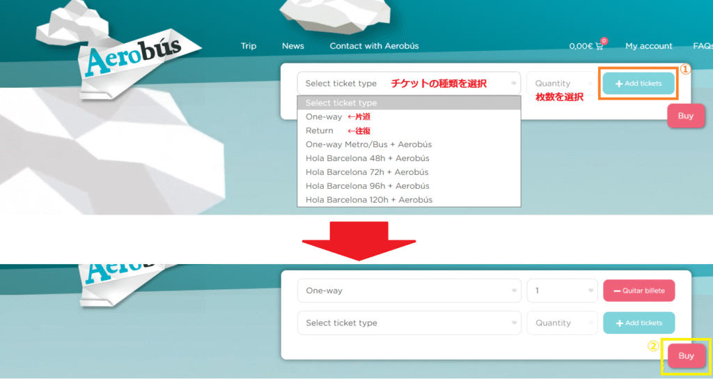 1.アエロブス(Aerobús)公式サイトにアクセスし、チケットの種類と枚数を選びます