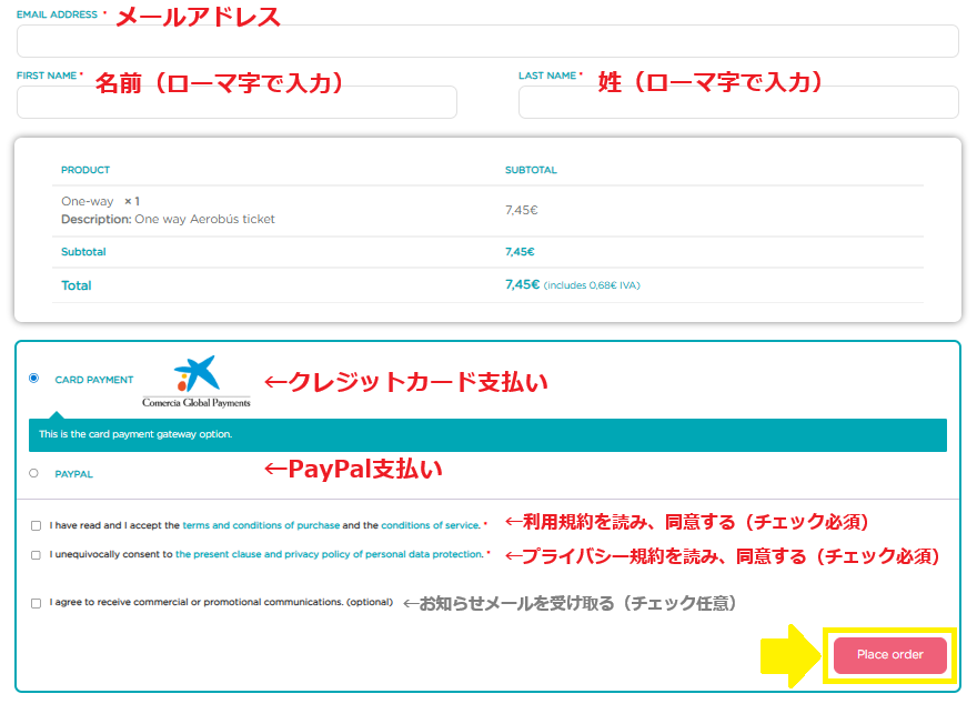 4.個人情報(名前、メールアドレス、クレジットカード情報等)を入力し、Realizar el pedido(ES)/Place Order(EN)ボタン②を押します