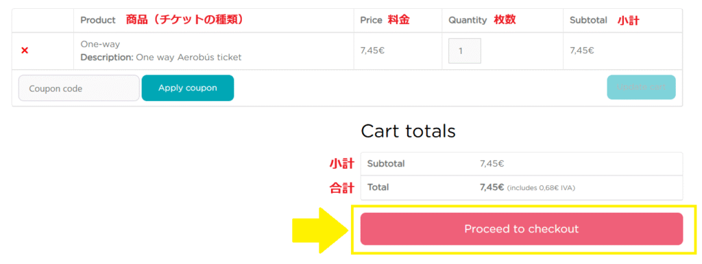 3.チケットの種類・枚数を確認したら、赤いFinalizar compra(ES)/Proceed to Checkout(EN)ボタンを押します