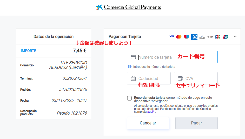 5.決済情報を入力し、Pagar(ES)/Pay(EN)ボタンを押します
